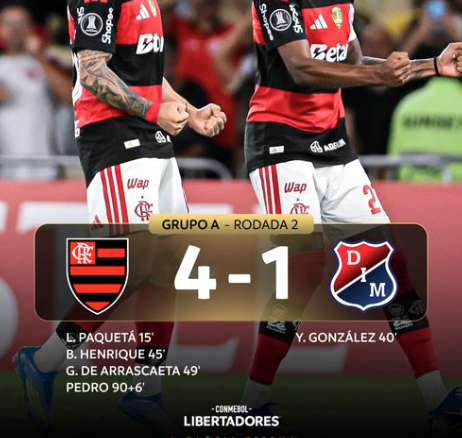Com atuação segura no Maracanã, no Rio de Janeiro, o Flamengo goleou o Deportivo Independiente Medellín (Colômbia) por 4 a 1, na noite desta quinta-feira (16), pela Copa Libertadores da América. Com o resultado, o Rubro-Negro chegou a seis pontos, manteve 100% de aproveitamento e assumiu a liderança do Grupo A.
